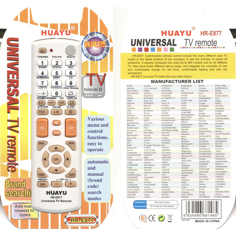 Универсальный пульт Huayu HR-E877 Orange изготовлен из качественных материалов и прошел проверку по сертификации CE. Сертификат соответствия СЕ – это международный сертификат соответствия Директивам Объединенной Европы. Поэтому этот пульт никогда вас не подведет!